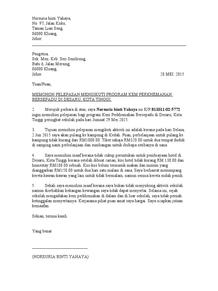 Contoh Surat Pengecualian Program Team Building Majlis Perwakilan Pelajar